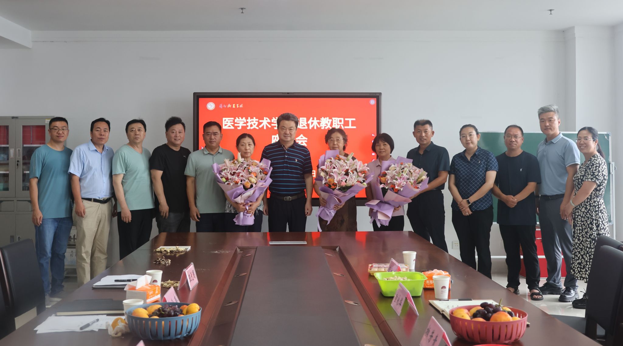 座谈会结束后,参会人员与三位退休教职工合影留念。