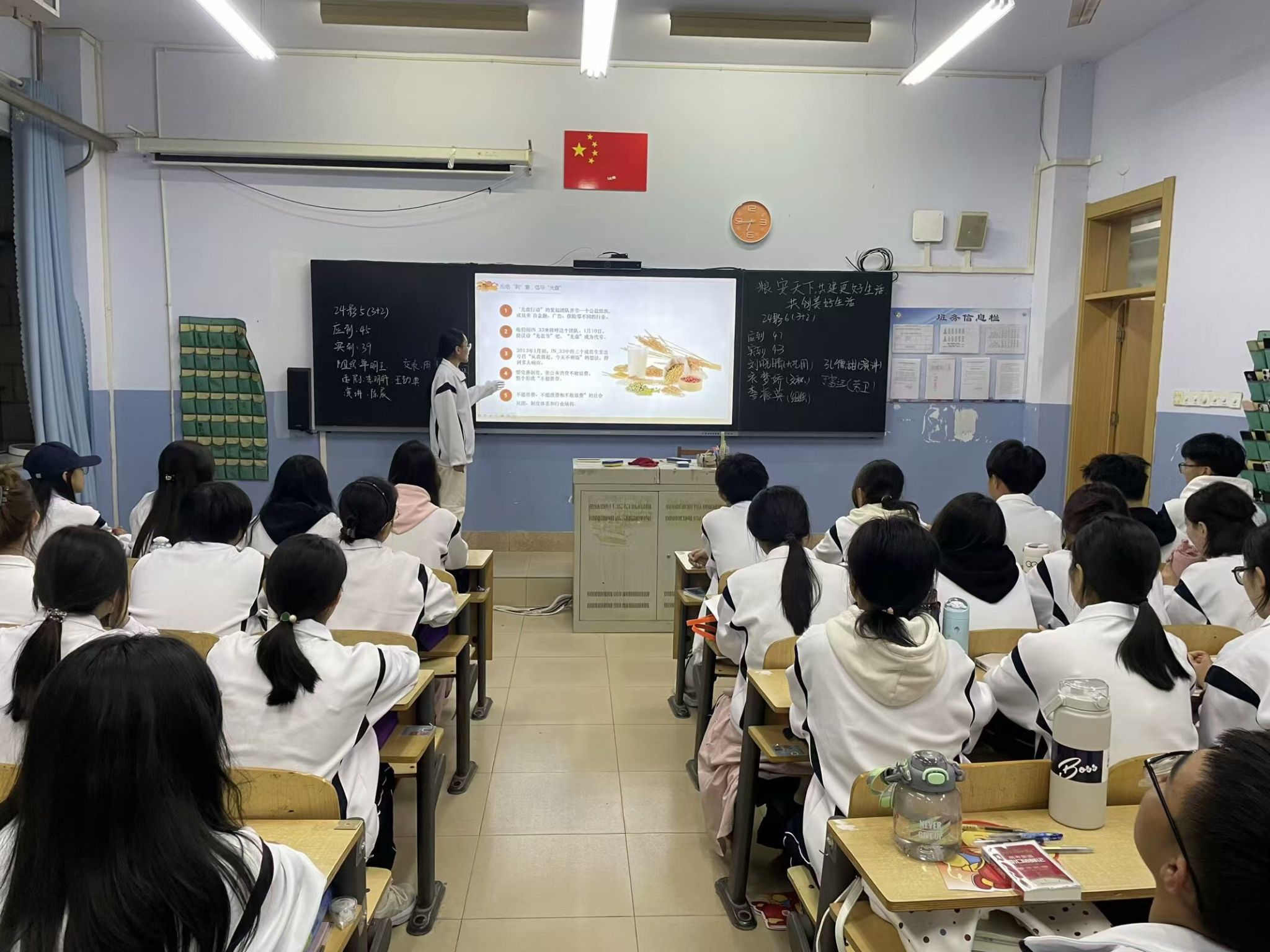 本次活动分为“增产不忘节约 消费不能浪费”、“拒绝舌尖上的浪费 光盘一族你我同行”、“拒绝‘剩’宴 倡导‘光盘’”、“加入光盘行动 节约从我做起”四个主题,由各班团支书通过讲解PPT的形式带领同学们了解粮食的珍贵,认识粮食安全的重要性,帮助同学们深刻认识到粮食安全对于国家的稳定和人民的幸福生活具有至关重要的作用。