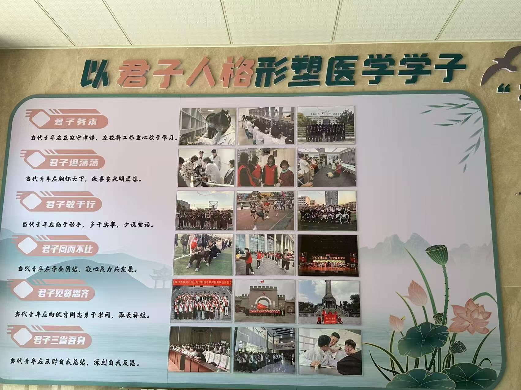 一、环境浸润,营造君子文化氛围。打造“君子文化墙”长廊:在教学楼、宿舍楼等员工日常活动区域,精心设计布置“君子文化墙”。墙面内容融合医学元素,展示古今中外兼具仁心仁术的“大医”典范、经典医德箴言,如《大医精诚》节选、君子品格内涵解读,以及员工践行君子之风的优秀事迹,使文化理念可视可感,时刻浸润学子心灵。