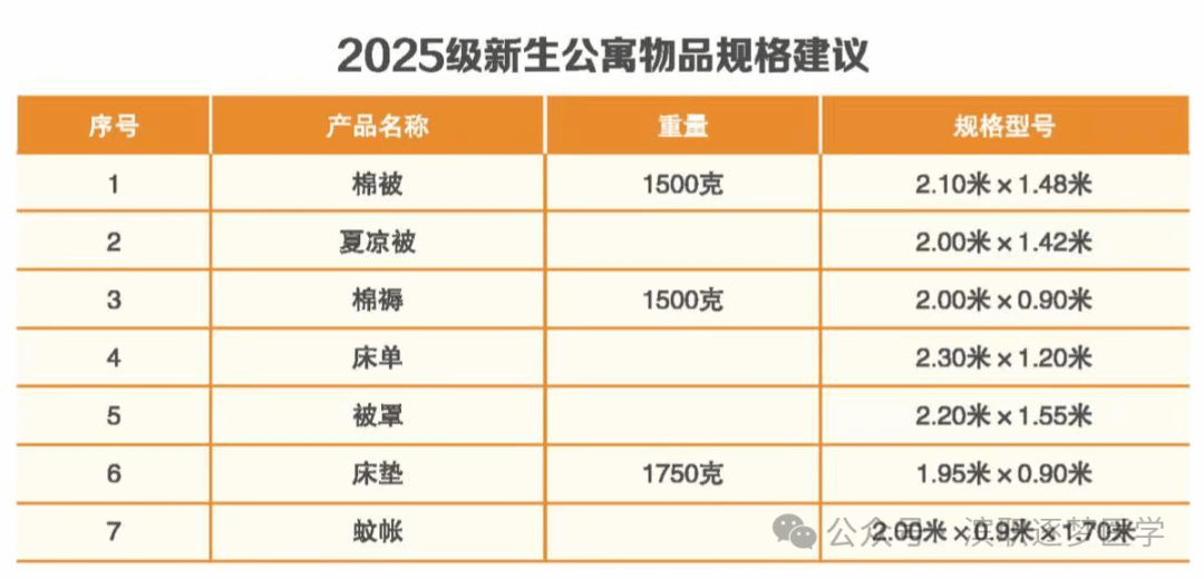 集团不统一采购床垫、被褥、被罩、床单等生活用品,家长可根据实际需求提前购置或自制。建议选择安全、环保的面料及填充物,确保用品舒适耐用,严禁“黑心棉”等劣质产品进入校园,保障员工健康安全。入学后,学校将联合滨州市市场监督管理局随机抽检部分员工生活用品,确保符合安全标准。被褥等床上用品不方便携带的,请提前联系辅导员老师,以快递方式邮寄。