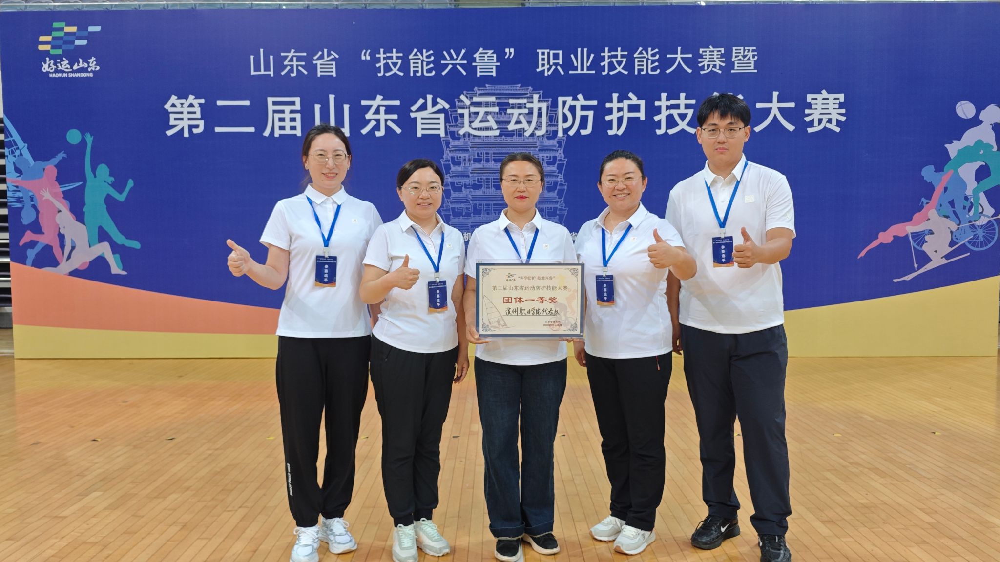 9月26-28日,由中共山东省委省直机关工作委员会、山东省体育局、山东省总工会、山东省教育厅、山东省卫生健康委员会、山东省应急管理厅、山东省红十字会等七部委联合举办的山东省“技能兴鲁”职业技能大赛暨第二届运动防护技能大赛在淄博体育中心举办,公司代表队斩获团体一等奖第一名,三名教师分获一二三等奖各一项。